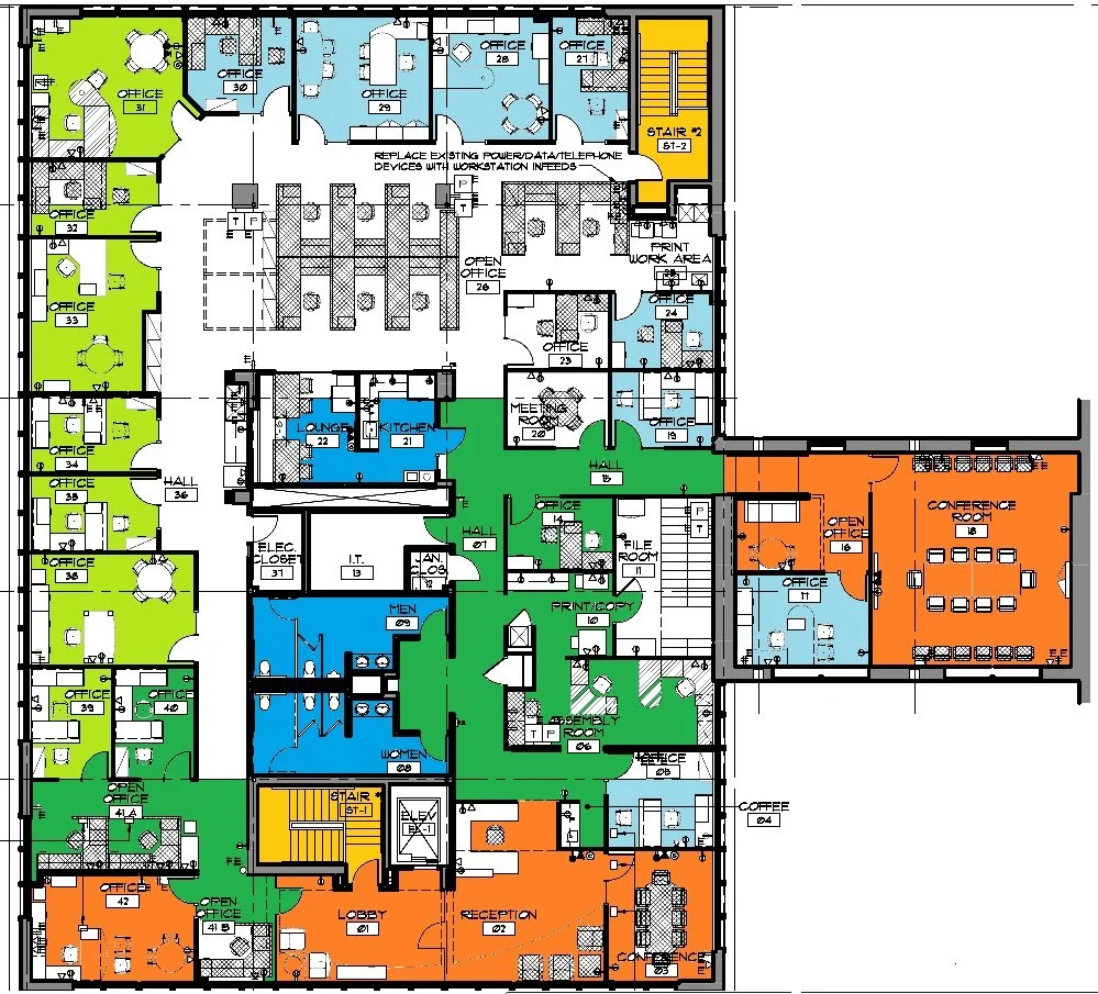 The colors on this client’s floor plan cue our cleaners as to what services to provide in what areas on a given weeknight as defined in an attached key.
